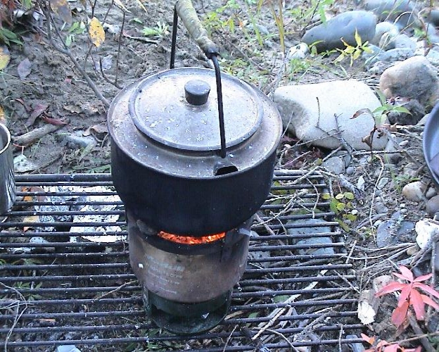Wildniskocher im Einsatz. Benütze ihn meisten zum Kaffee kochen nach dem Aufstehen. Er ist ein Allesbrenner und selbst bei strömenden Regen funktioniert er noch (Schmiedefeuerprinzip, benötigt aber eine Batterie oder eine Solarzelle.)